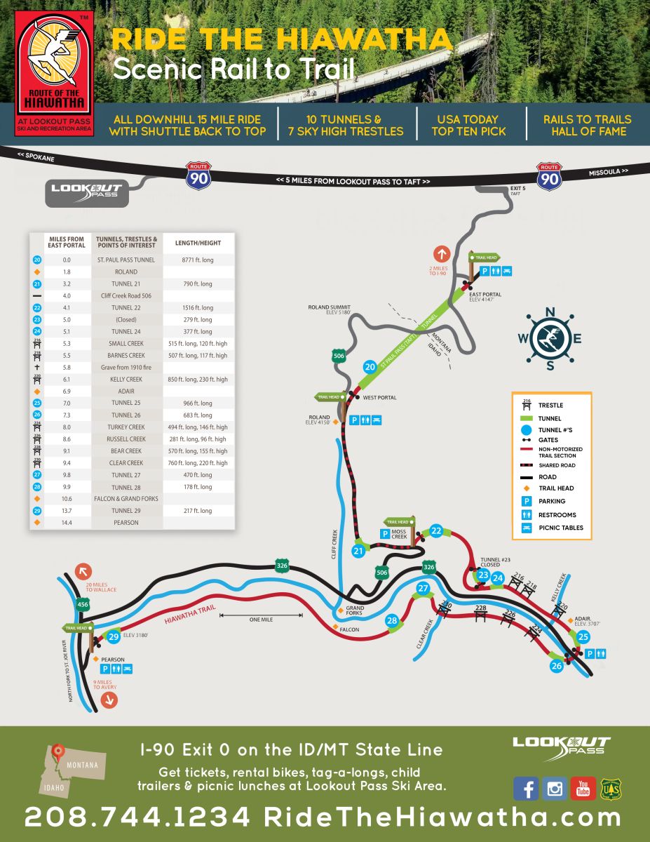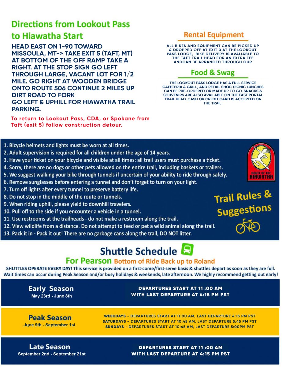 Route of the Hiawatha 2025 Trail Map - Back Page with Driving Directions, Rules & Shuttle Schedule hours.