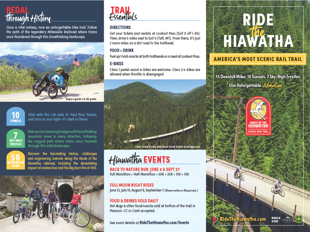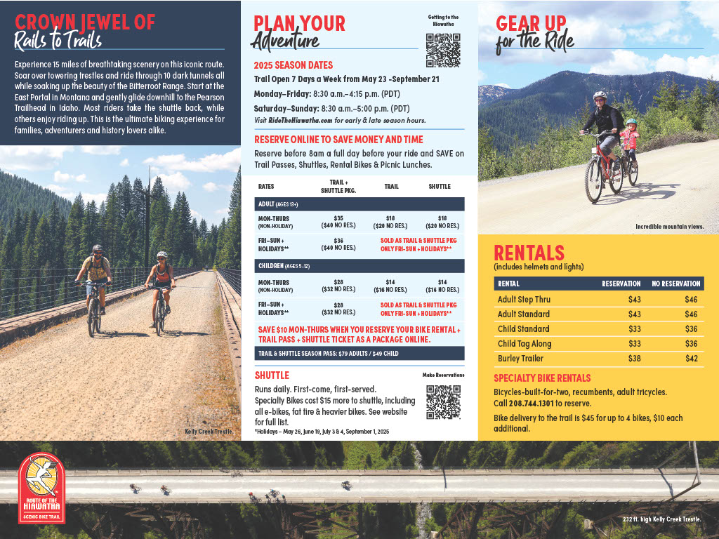 Route of the Hiawatha Back Page of Brochure 2025 with Hours, Trail Tickets, Shuttle Tickets & Rental Bike Pricing.
